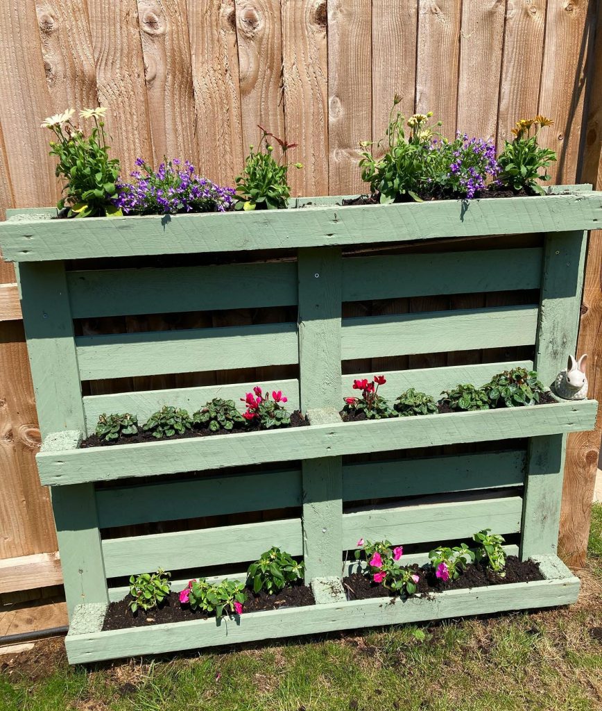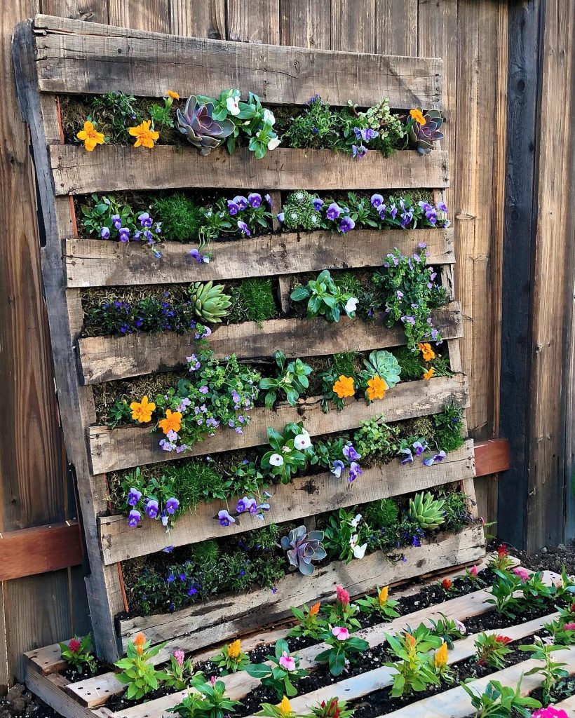 The painted pallet stands upright against a wooden fence and creates a neat vertical planting display.