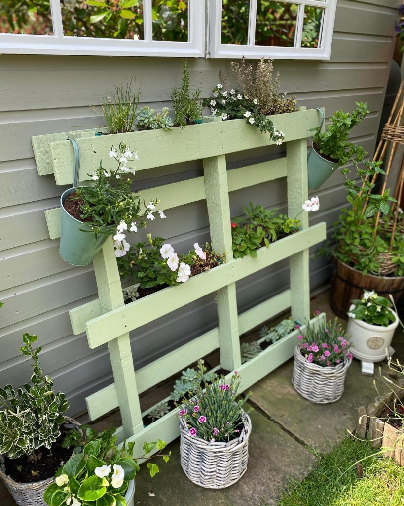 The pallet stands upright and holds narrow planter boxes filled with herbs, flowers, and trailing plants.