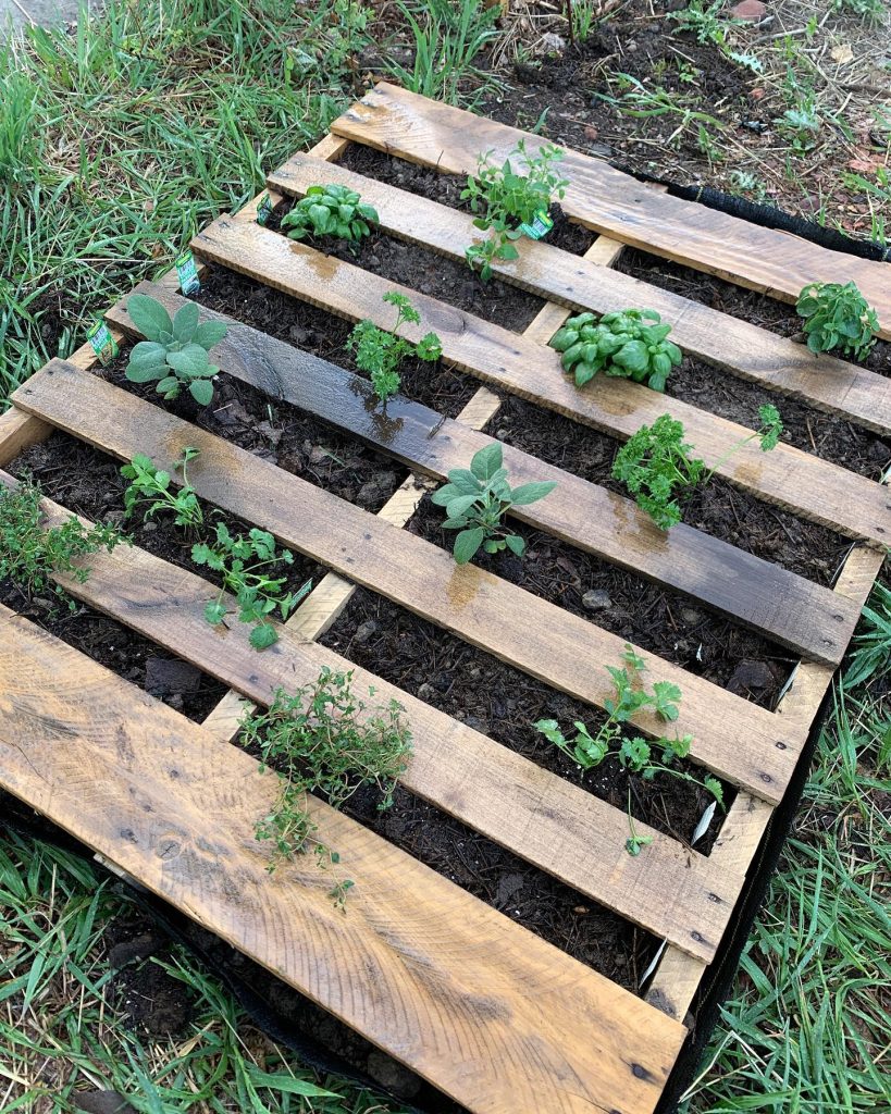 This pallet garden uses a wooden pallet placed flat on the ground to create a simple herb planting bed.