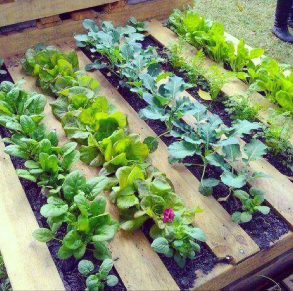 This pallet garden turns a wooden pallet into a structured vegetable bed where plants grow between the slats.