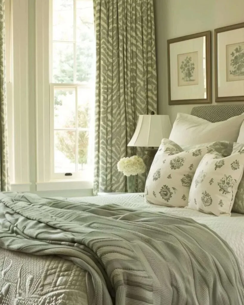 The patterned curtains blend seamlessly with the sage quilt and throw, creating a coordinated, unified look. Soft floral pillows bring charm, complementing the framed botanical prints above the bed.
