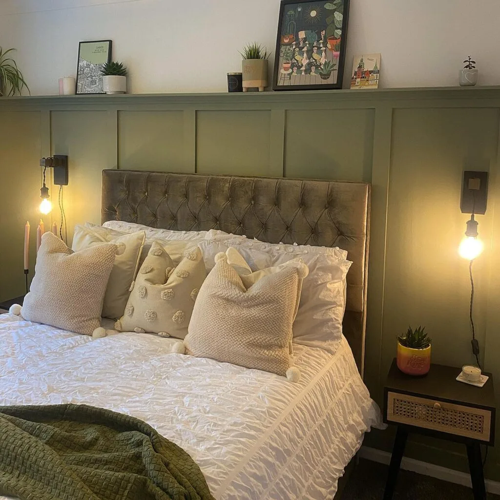 This sage green bedroom creates a cozy, inviting atmosphere with its layered textures and soft lighting.