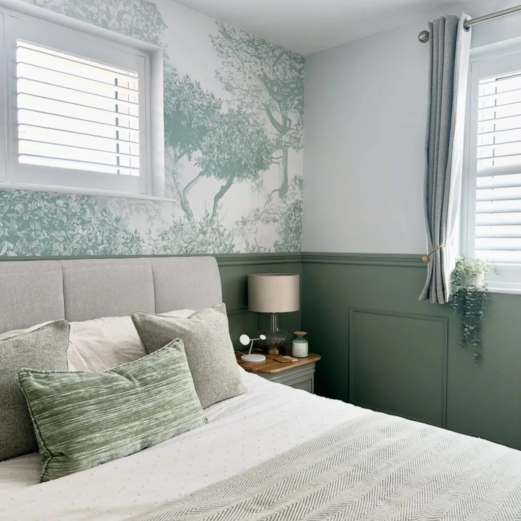The lower wall panels in sage pair beautifully with the illustrated wallpaper, depicting serene trees in soft green tones. A neutral upholstered headboard and textured bedding maintain a calming balance, while green accent pillows enhance cohesion.