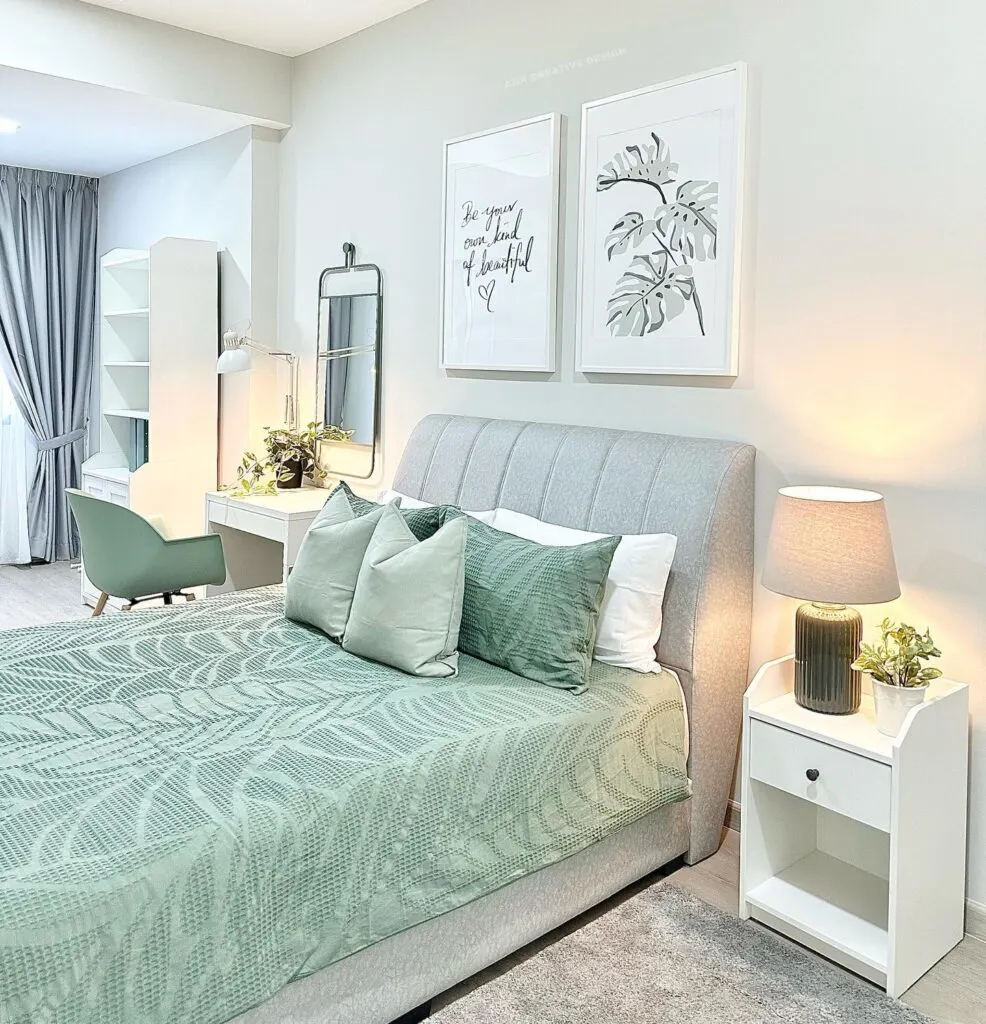 The neutral lamp and crisp white bedding balance the green tones, ensuring the space feels fresh and bright. Natural light from the window enhances the softness of the palette. Adding a textured rug or a woven basket could enhance the cozy, layered atmosphere.