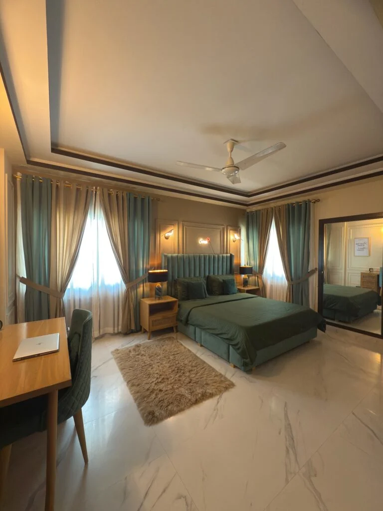 The deep green palette creates richness, complemented by gold-accented curtains and warm wooden furniture. A soft shag rug softens the glossy marble flooring, balancing sophistication with comfort.