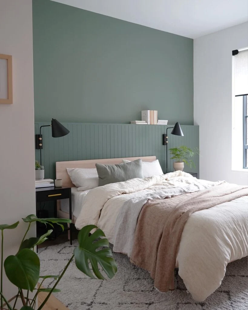 This sage green bedroom achieves a modern, stylish look with layered textures and bold lighting.