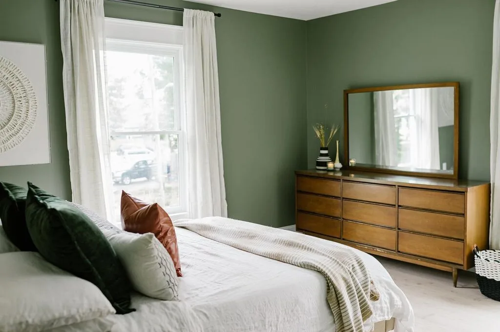 This modern sage green bedroom balances earthy tones with sleek, minimalist styling for a grounded yet inviting look.
