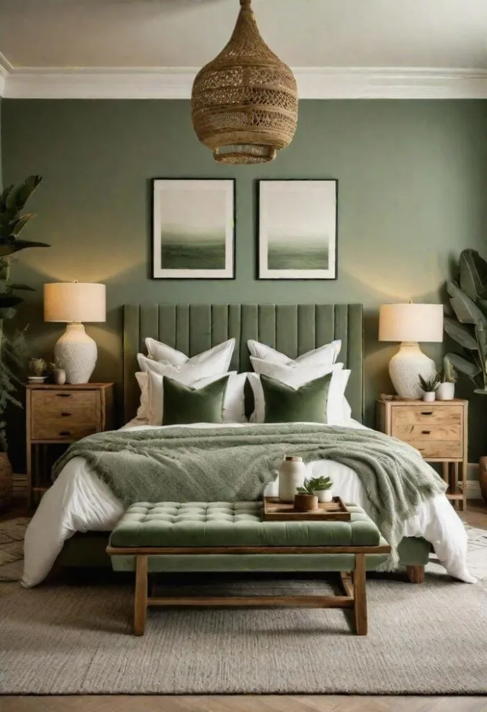 This sage green bedroom combines earthy textures and lush greenery, creating a refreshing and inviting retreat.