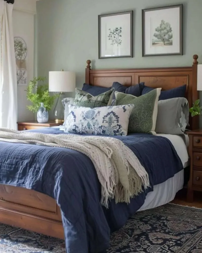 This sage green bedroom combines rich navy textiles with warm wooden furniture, creating a balanced and welcoming look.