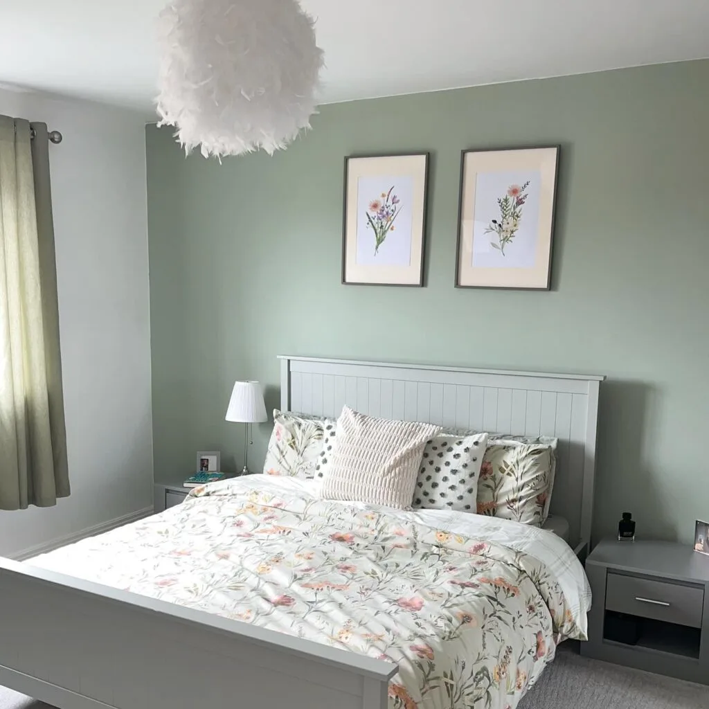 This sage green bedroom feels fresh and welcoming, combining soft tones with delicate floral accents.