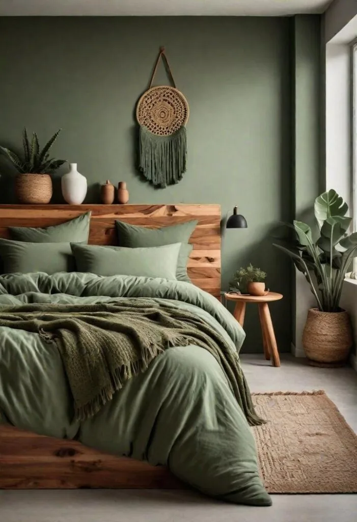 The solid sage bedding pairs beautifully with the warm wooden headboard and matching side table. Textured accents, including a woven wall hanging, jute rug, and clay vases, add rustic charm. Large potted plants near the window bring freshness while soft natural light brightens the green palette.
