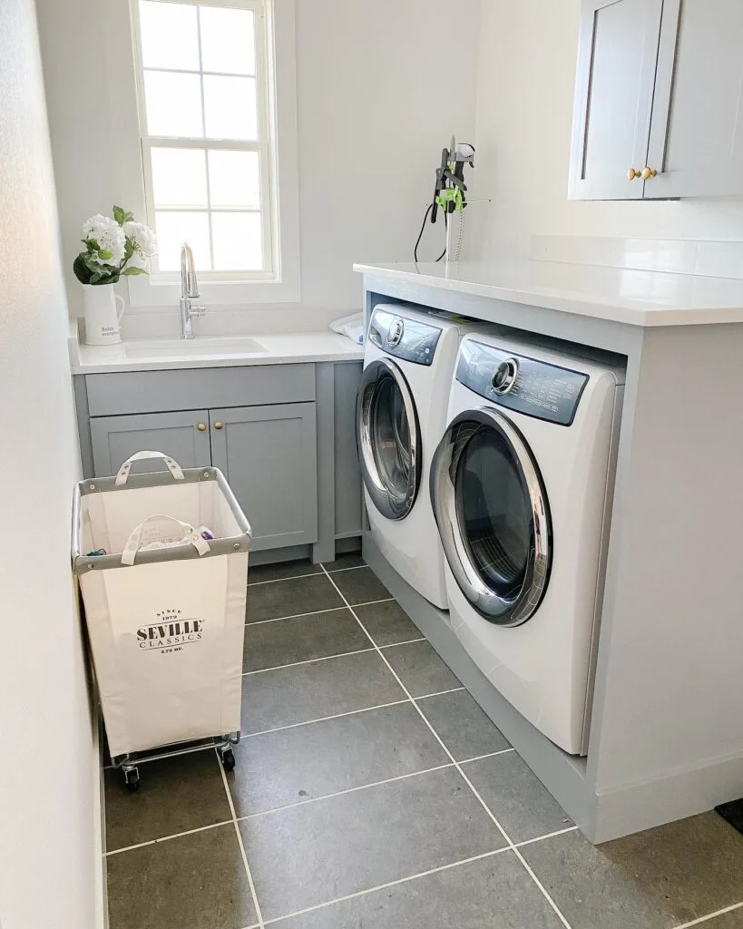 This small laundry room feels open and fresh, featuring soft gray cabinetry and bright white countertops.