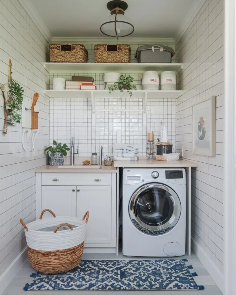 This small laundry room combines classic style with efficient organization. White square tiles line the walls, brightening the space and reflecting natural light.