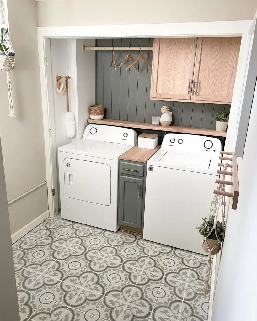 A soft green shiplap wall pairs beautifully with natural wood cabinetry and countertop, creating warmth and balance. The patterned tile floor adds visual interest, while a central cabinet provides extra storage and folding space.