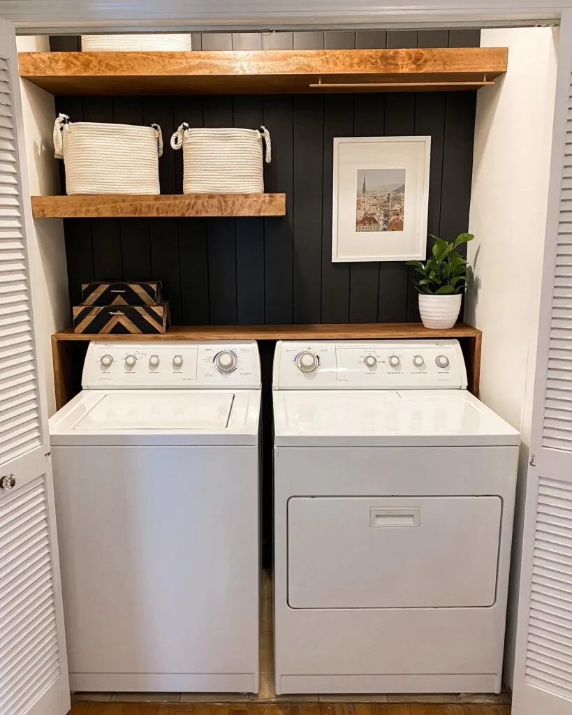 This compact laundry room transforms a closet space into a stylish, organized washing area. A striking black shiplap wall adds modern contrast, while warm wooden shelves provide functional storage and decorative opportunities.