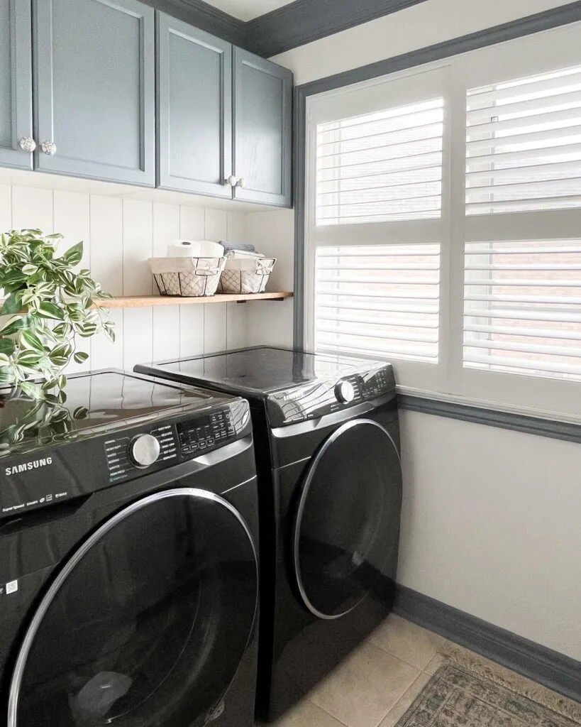 This small laundry room feels refined and calm with soft blue cabinetry and matching window trim. Matte black front-loading machines create bold contrast while maximizing available space.