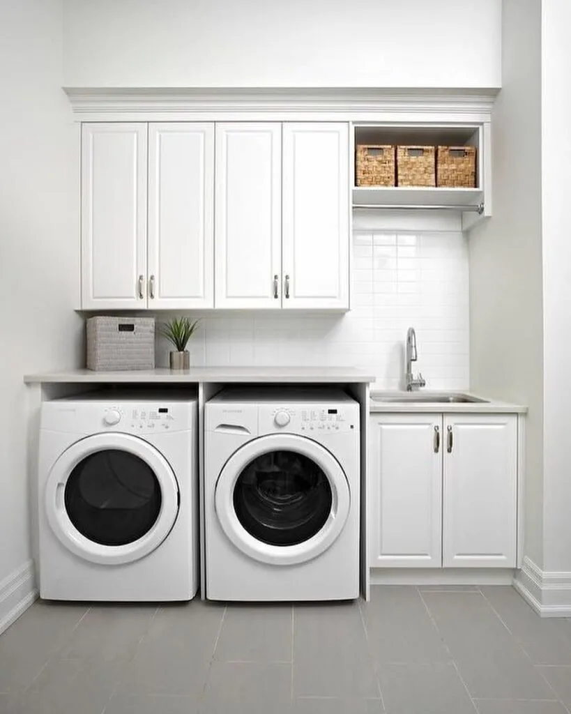 A compact sink adds functionality for quick hand-washing or spot cleaning. Installing under-cabinet lighting or a retractable drying rod could further enhance convenience, making this crisp, streamlined laundry space even more efficient and welcoming.