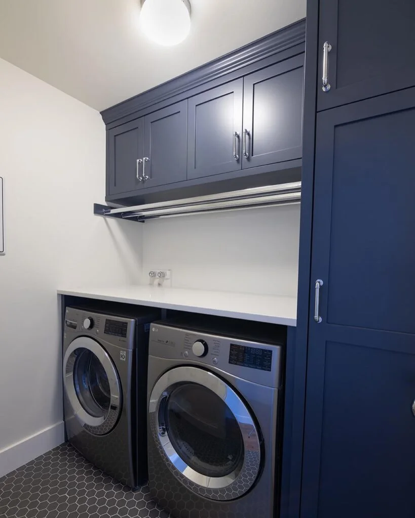 Laundry Room with Deep Blue Cabinetry and Sleek Storage
