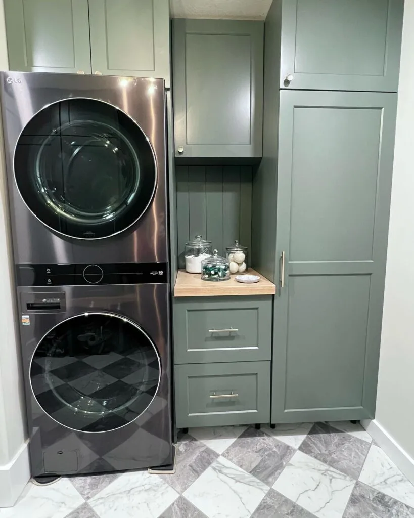 Sleek graphite stacked washer and dryer fit neatly beside soft green cabinets, which offer generous hidden storage. A small wood-topped counter provides a handy spot for sorting or displaying essentials like jars of detergent and dryer balls.
