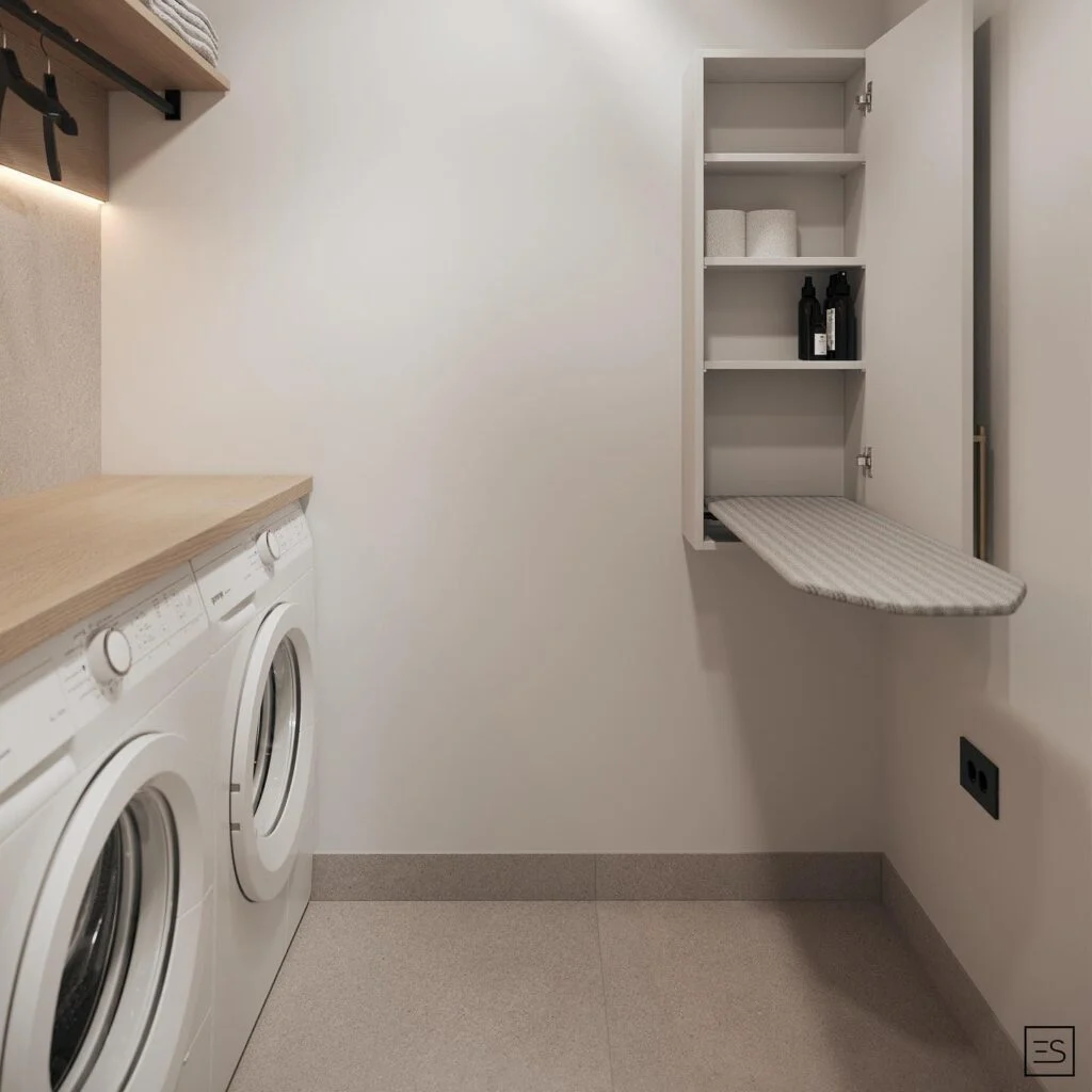 Open shelves and a hanging rod keep laundry essentials and clothing easily accessible. Hidden LED strip lighting highlights the work area, creating a warm, inviting glow. A built-in wall cabinet hides an ironing board that folds out when needed, saving space.