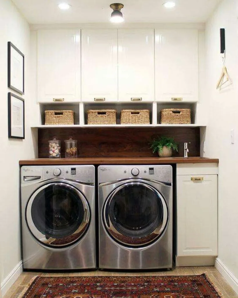 This small laundry room combines warmth and practicality with layered storage and natural textures. Stainless steel front-loading machines fit perfectly beneath a rich wooden countertop.