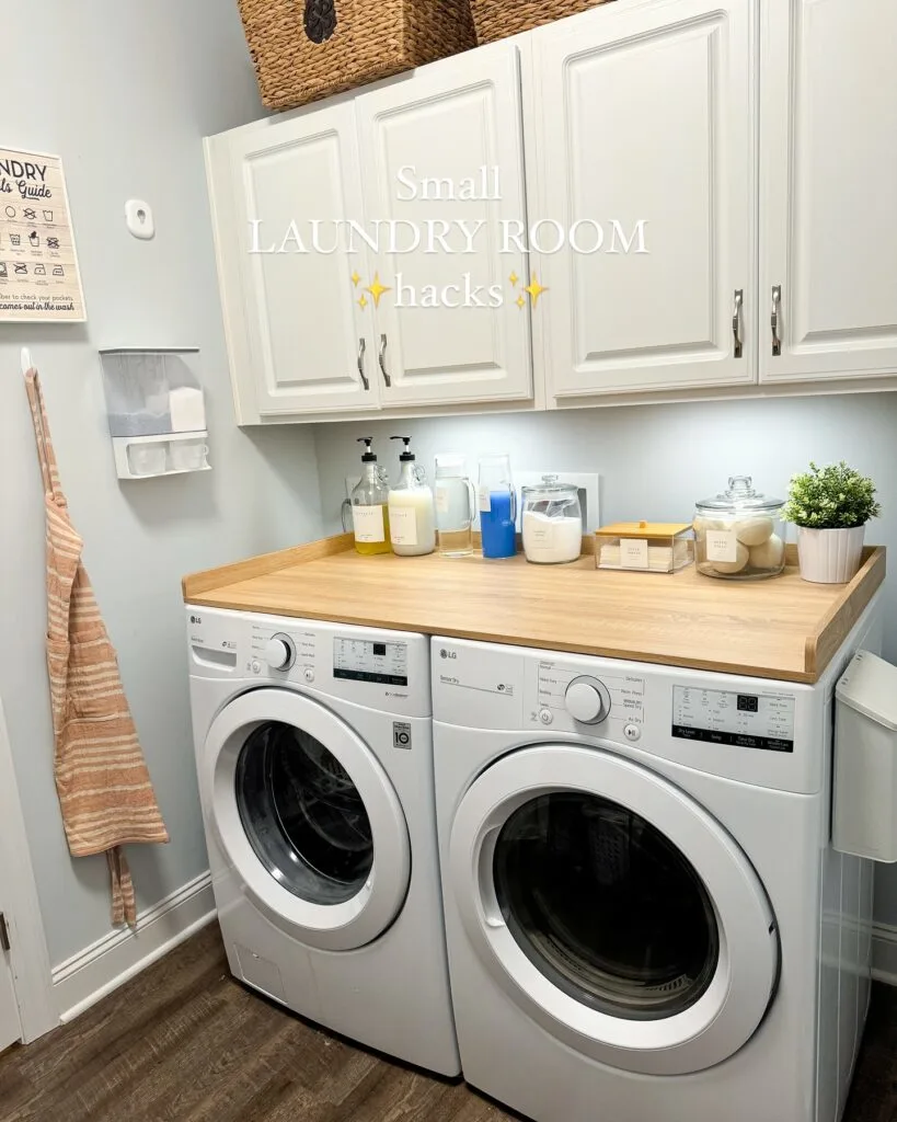 This sleek small laundry room showcases smart organization with modern, minimalist style. Twin front-loading machines fit beneath a wide wood countertop, offering generous folding space.