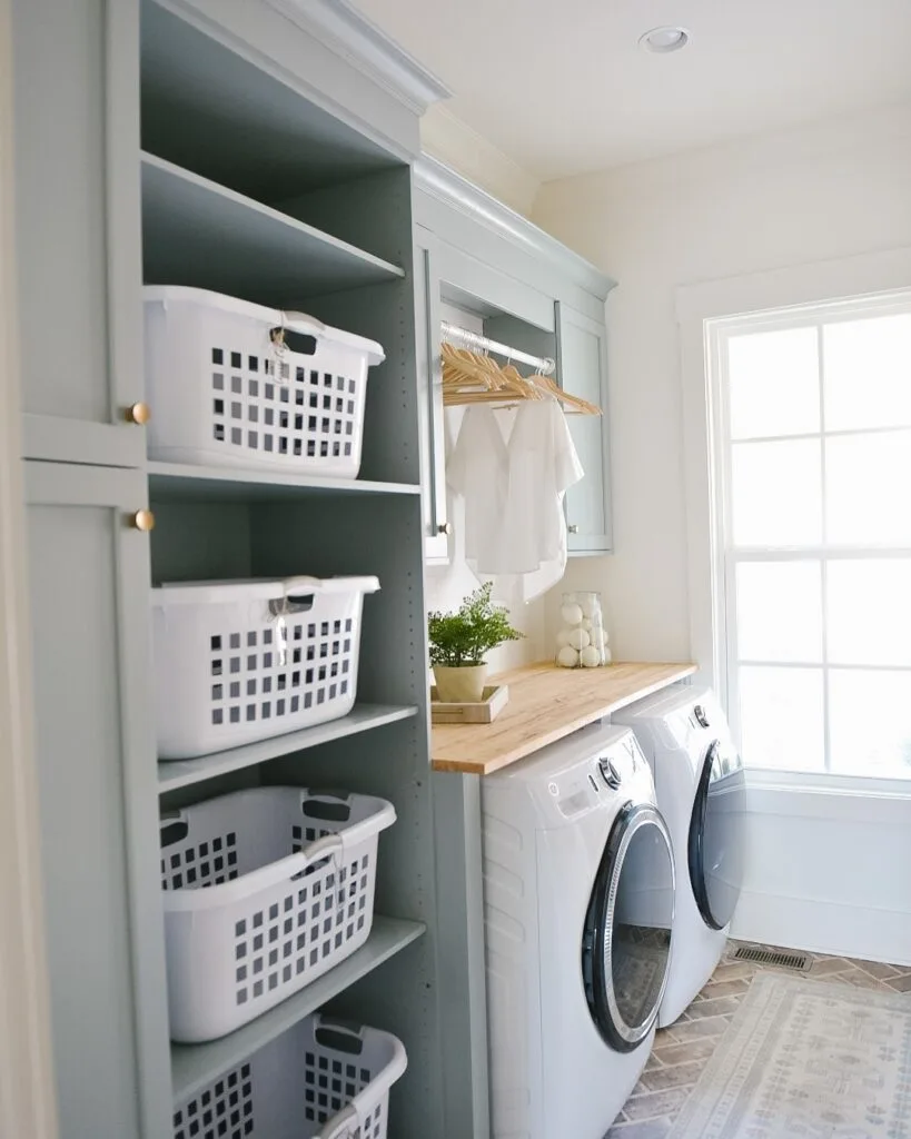 Soft green cabinetry contrasts beautifully with bright white walls, adding calm color. Consider adding pull-out shelves for easier access to the baskets, further increasing convenience while maintaining the clean, stylish look of this functional laundry space.