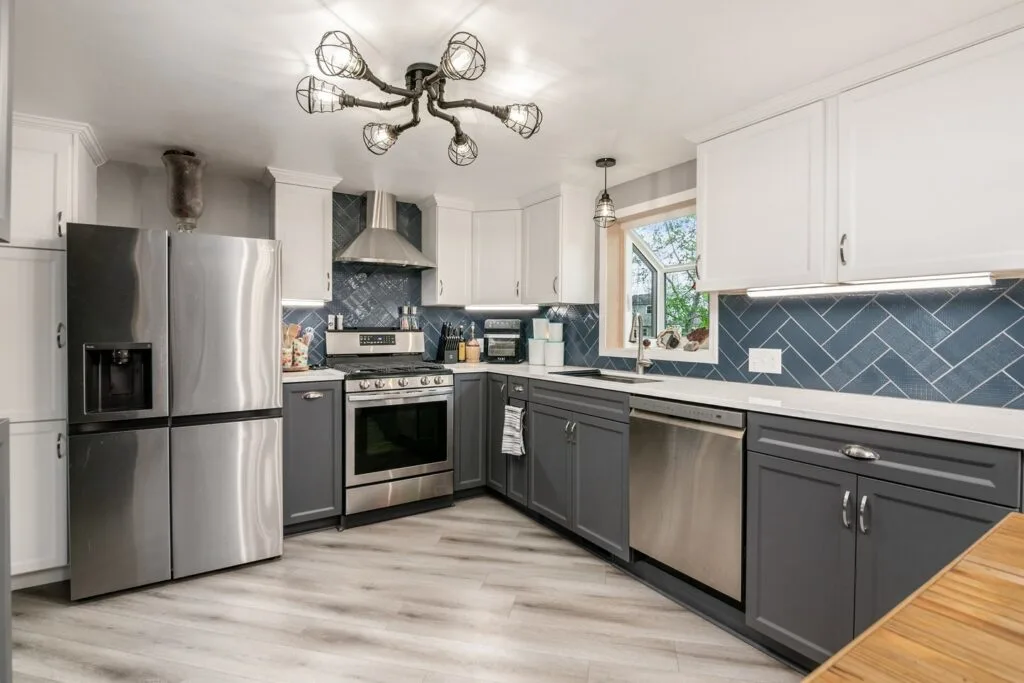 This striking two-tone kitchen features deep charcoal lower cabinets paired with crisp white uppers for a bold yet balanced look. A stunning navy herringbone tile backsplash adds depth and texture, creating a stylish focal point.
