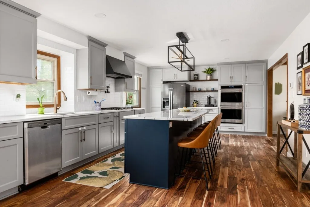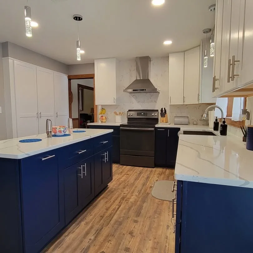 This sophisticated two-tone kitchen features soft gray cabinetry paired with a bold navy island for a balanced and modern look. The deep blue island adds contrast and depth, while sleek white marble countertops brighten the space.