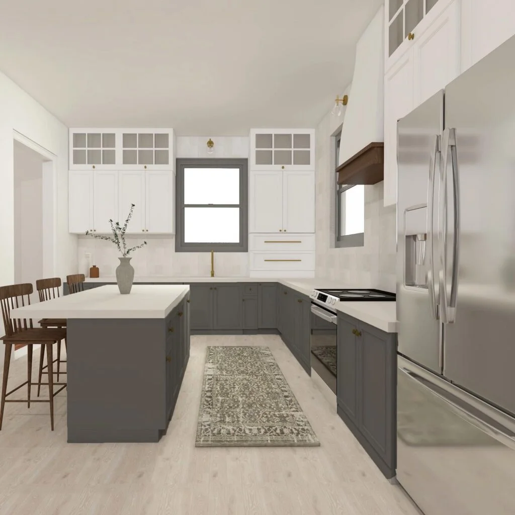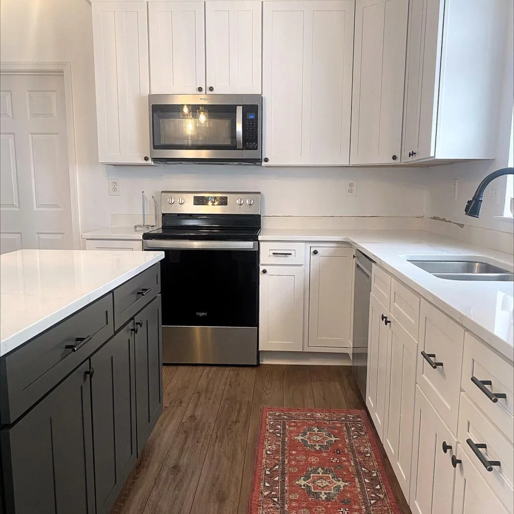 A white quartz countertop keeps the space bright, while the dark island anchors the design. Stainless steel appliances and a black gooseneck faucet enhance the contemporary feel. A warm-toned vintage runner softens the look, making this kitchen both stylish and inviting. Perfect for those who love a modern classic aesthetic.