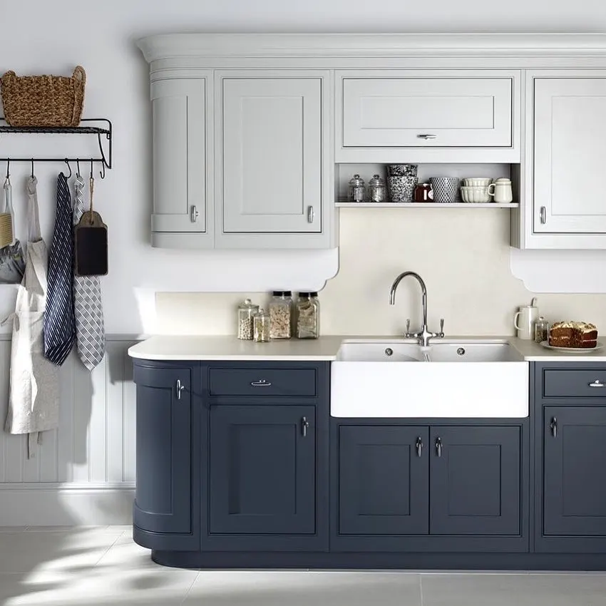 This elegant two-tone kitchen blends navy lower cabinets with soft gray upper cabinetry for a timeless farmhouse-inspired look. The deep blue base adds depth and character, while the curved edges and shaker-style doors enhance the traditional charm.