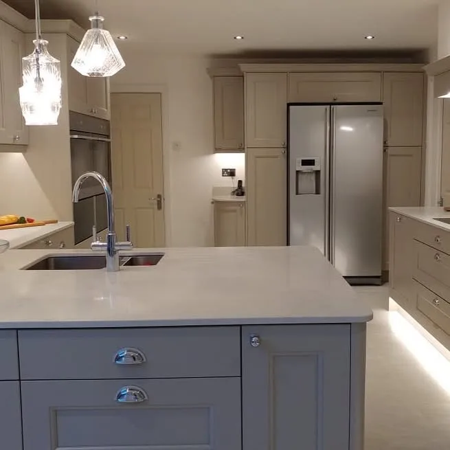 Chrome cup handles add a classic touch, while pendant lighting enhances the bright and airy feel. Integrated appliances and subtle under-cabinet lighting contribute to the seamless design. Perfect for those who appreciate a refined, neutral-toned kitchen with a balance of elegance and practicality.