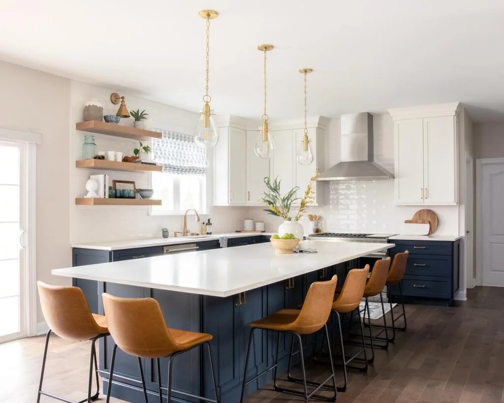 This two-tone kitchen pairs crisp white upper cabinets with a deep blue island for a striking contrast. The navy-blue base adds a bold yet elegant touch, while gold hardware enhances the sophistication. White marble countertops brighten the space, balancing the darker tones.