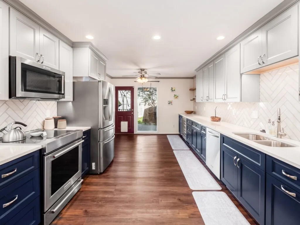 This elegant two-tone galley kitchen combines deep navy lower cabinets with soft white uppers for a fresh and balanced look. The navy base adds depth and sophistication, while the white cabinetry keeps the space feeling open and airy.