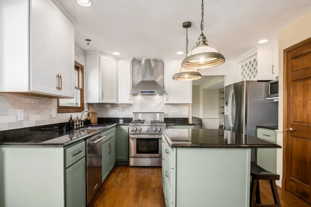 This charming two-tone kitchen pairs soft sage green lower cabinets with crisp white uppers for a fresh and inviting look. The muted green base adds warmth and character, beautifully complemented by dark granite countertops.