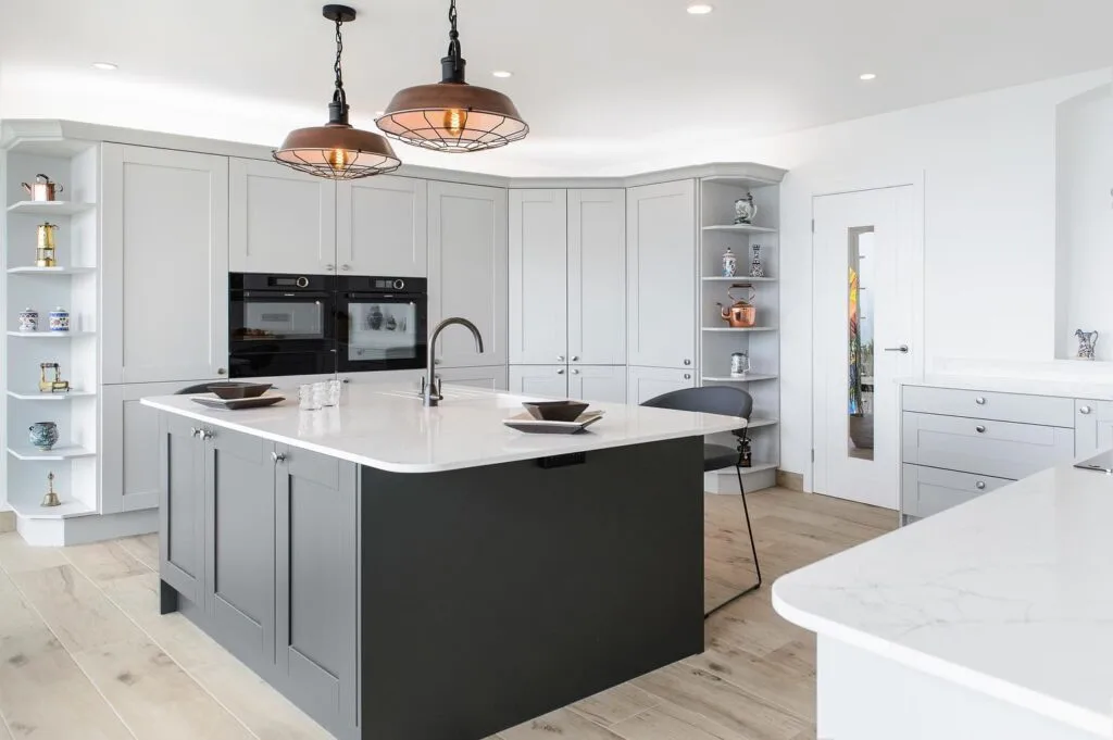 White quartz countertops enhance the bright and clean look, while industrial-style pendant lights introduce warmth and character. Built-in black appliances blend seamlessly for a streamlined effect. Open shelving adds a decorative touch, making this kitchen perfect for those who appreciate a stylish yet functional space.
