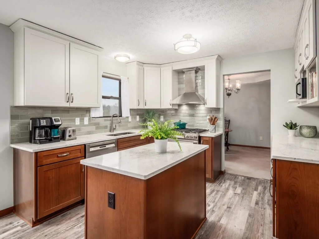 A light quartz countertop and subtle backsplash add sophistication, complementing the stainless steel appliances. The balanced color scheme brings depth and dimension, making the space feel welcoming yet refined. This design is perfect for those who love a mix of classic and contemporary elements.
